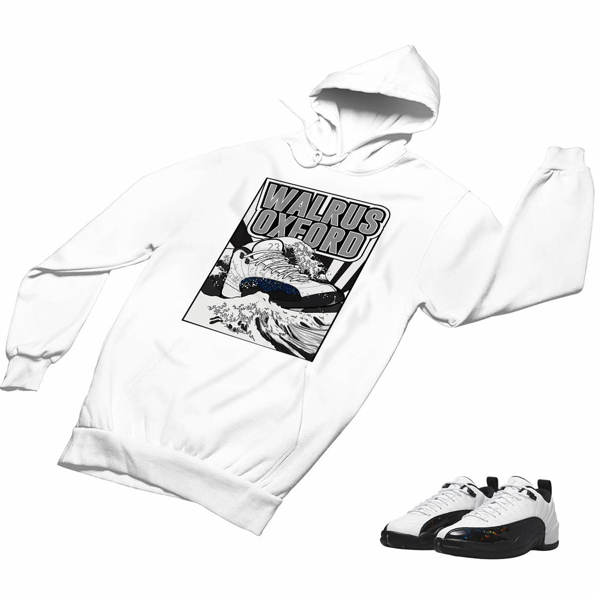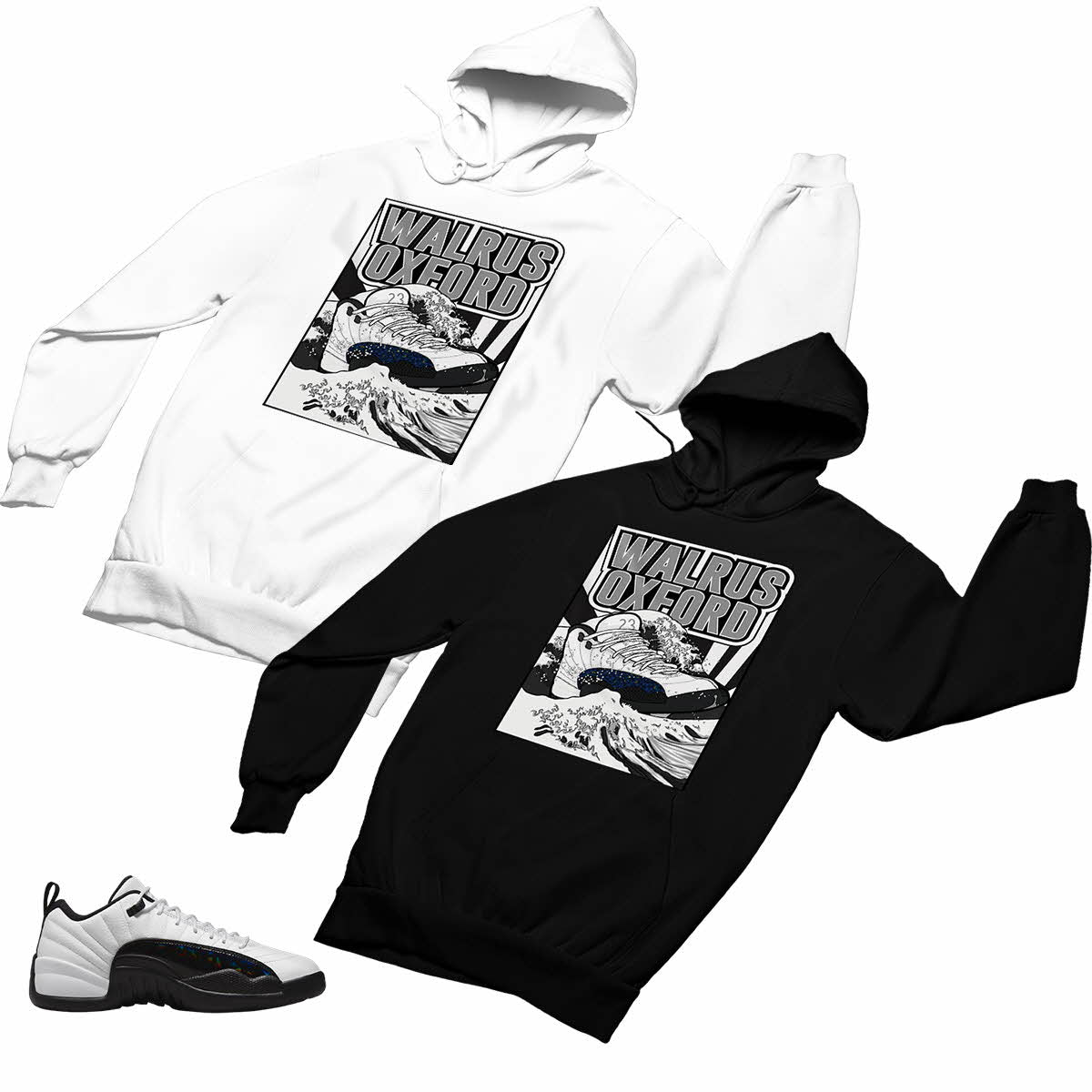 Jordan 12 Low White and Black Matching Custom Designed Hoodies JD 12-26-H-22 - BLACK / S is backordered. It will be shipped when back in stock.
