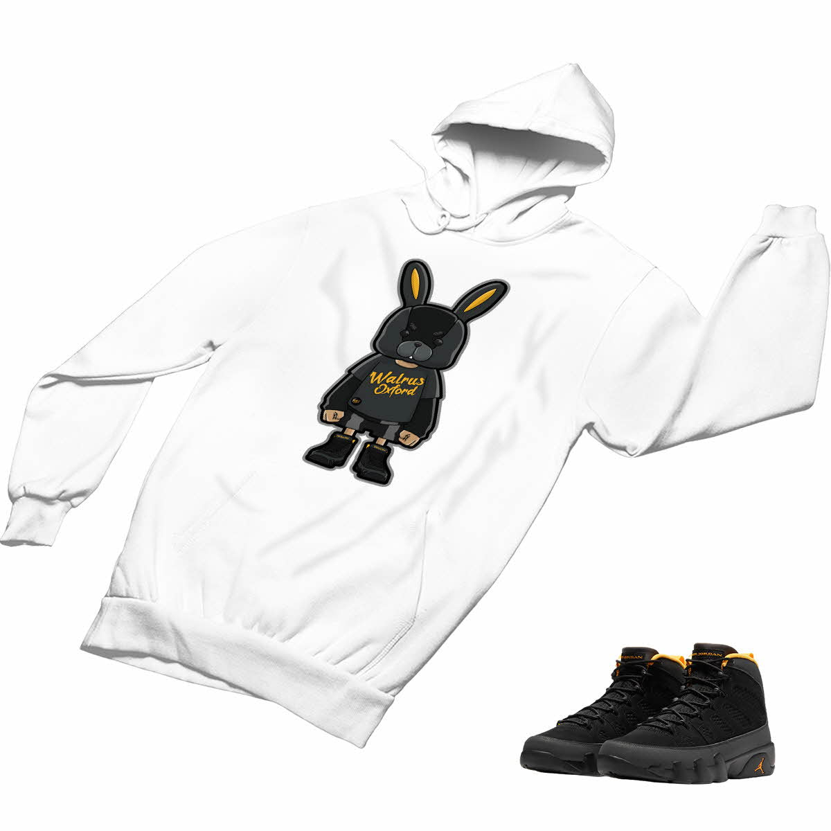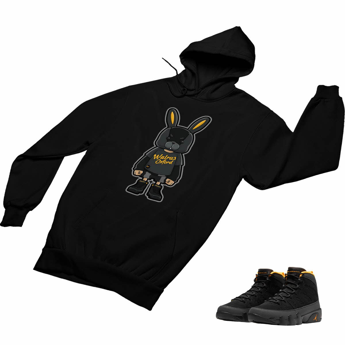 Jordan 9 University Gold Matching Custom Designed Hoodies JD 9-9-26 - BLACK / S is backordered. It will be shipped when back in stock.